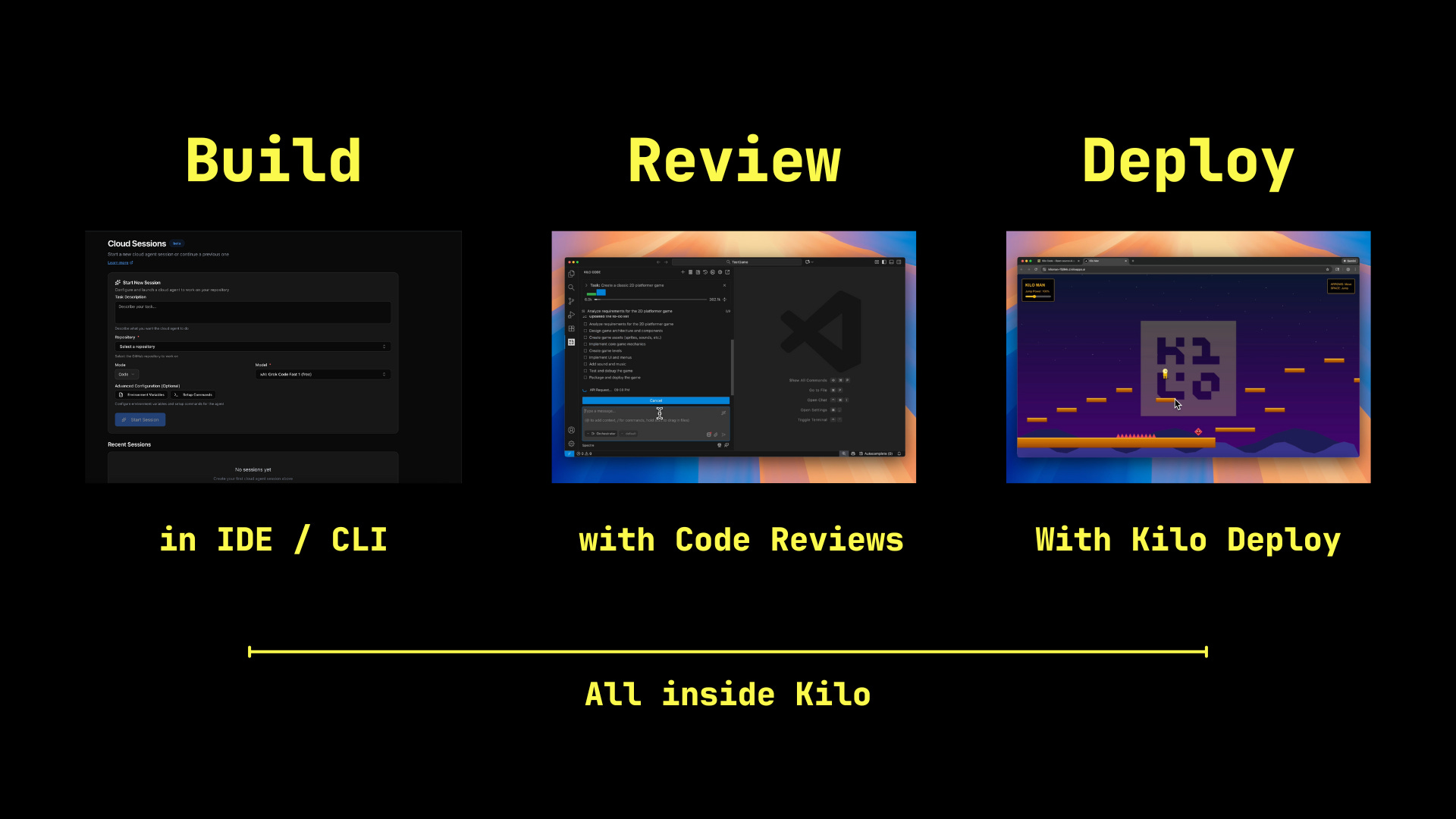 Kilo’s Code Reviews is part of the Kilo platform, the same environment where you’re already writing code, debugging, and deploying. Your reviews happen alongside: