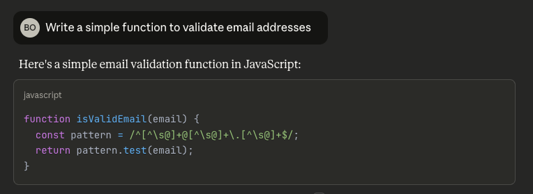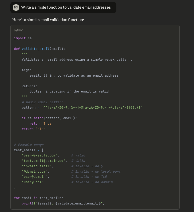 All three responses are technically “correct”. None match what I would’ve written. They’re not even in the same language. If I accepted the first without thinking, I’d ship a regex with untested edge cases.