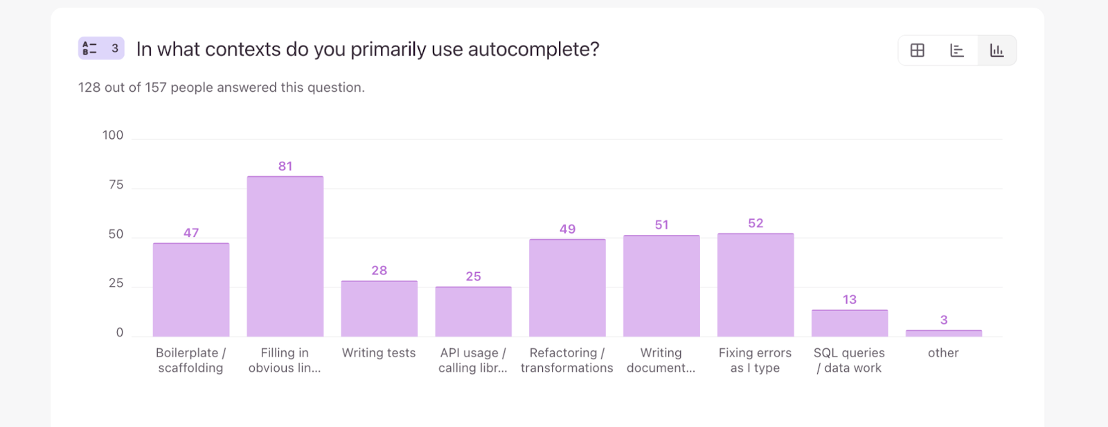What we learned: Autocomplete usage is heavily concentrated in dynamically typed and web-focused languages. TypeScript/JavaScript (72) and Python (64) account for most responses, followed by HTML/CSS (37) and Markdown (18).