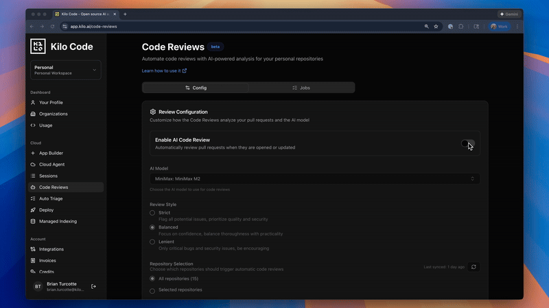 Code Reviews is available now in the Kilo Dashboard at https://app.kilo.ai/code-reviews. To enable: