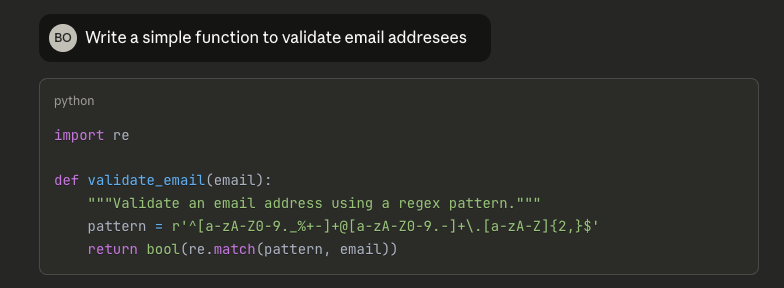 All three responses are technically “correct”. None match what I would’ve written. They’re not even in the same language. If I accepted the first without thinking, I’d ship a regex with untested edge cases.
